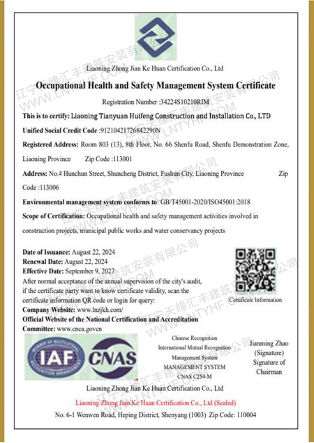 職業健康安全管理體系認證證書